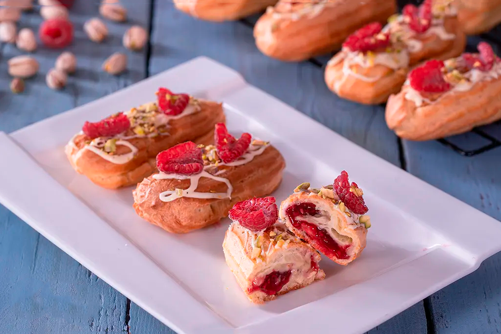 Эти мини-эклеры с фисташково-малиной представляют собой восхитительную выпечку, в которой сочетаются неотразимые ароматы фисташек и острой малины.
