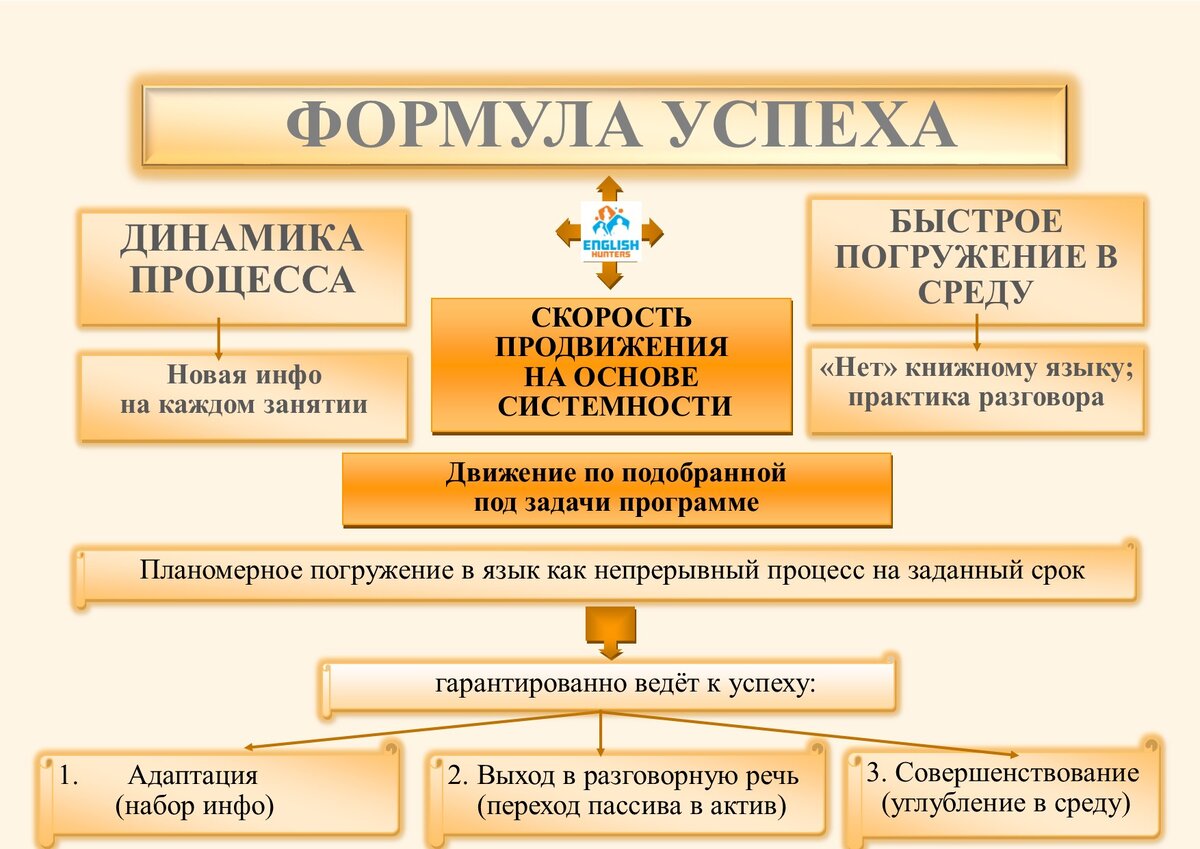 Успех наших студентов - дело техники🙂. В основе формулы успеха заложены: 1. ✨Динамика процесса. Занятия проходят так, что на каждом из них поступает новая информация: cлова📚, грамматика🔗 и - оттачиваются навыки их использования (чтение и перевод, развитие разговорной речи). 2. ⏫ Скорость на основе системности в работе: cоставляется программа📃, по которой идёт планомерное движение. Есть ли у студента время на выполнение домашних заданий или нет, на процесс сильно не влияет - каждое занятие позволяет на шаг продвинутся вперёд. Главное - системное участие в процессе, наличие студента на занятиях. Таким образом, даже самые занятые студенты прогрессируют. 3.🎯 Эффективность на основе быстрого погружения в среду (песни, видео, оригинальные статьи, носители). Мы против "книжного языка", занятий по учебникам, затянутых курсов. Практика разговорной речи на правильной основе + необходимая для этого грамматика. В итоге создаются условия для погружения в язык в непрерывном процессе на