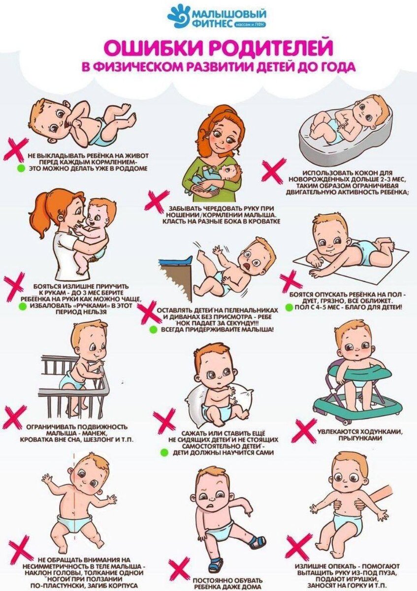 1. Боятся класть на живот с первых недель. — Можно уже в роддоме, начните с выкладывания себе на грудь. 2. Боятся опустить на постоянное «место жительства» на пол с 3-4 мес (холод, сквозняки, затопчут старшие дети). — Найдите эту возможность, это залог правильного физического развития. 3. Поднимают ребёнка, взяв за конечности (чаще всего за руки). — До года берите только за корпус. Если надо взять из кроватки — одну руку подводим под спинку, другой рукой обхватываем ножки. 4. Сажают попой на руку ребёнка в процессе ношения на руках, пока он сам не садится, до 6 мес точно не, а чаще до 8 мес стоит подождать. — Прижимайте ребёнка к себе по всей длине его тела, например, положив руку на крестец, а ещё лучше давать ребёнку возможность как можно больше находиться на полу. 5. Сажают ребёнка любым образом, который ещё не умеет сидеть самостоятельно. — После 5 мес можно не более, чем под 45 градусов, но старайтесь не более 40 мин подряд, после этого смена положения и легкая разминка. 6. Ставя