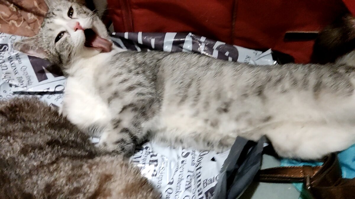 Коты нализываются под ласковым присмотром хозяйки. Особенно старается Михрютка. А Белка уже клюёт носом. Самому умываться лень, авось мелкая оближет заодно.