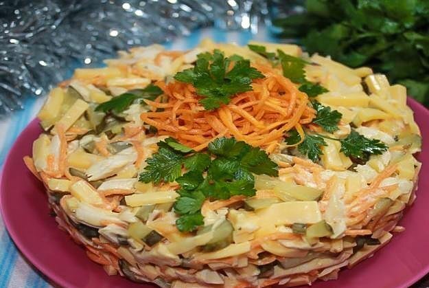 Приближается семейный праздник, который с трепетом и нетерпением ждут и дети, и взрослые - Новый год. Остается чуть больше месяца и многие хозяйки уже задумались - что бы приготовить к праздничному столу. Вот 3 полезных идеи: 1. Салат с грудкой и корейской морковкой Несмотря на то, что приготовить этот салат несложно, он получается очень вкусным. Все ингредиенты идеально сочетаются и дополняют друг друга. Он даже может претендовать на звание "фаворита" праздничного стола. Потребуется: 1. Нарезать твердый сыр, маринованный огурец, отварную куриную грудку. 2. Подготовленные ингредиенты переложить в глубокую миску и перемешать. 3. Добавить к ним морковь по-корейски и майонез. Тщательно всё перемешать. 4. Затем переложить в салатник и украсить зеленью. Вот и всё - вкусный салат готов! 2. Рулет из салями Это ещё одна вкусная закуска. Салат с салями - быстро и легко приготовить. Для этого понадобится: 1. Разложить ломтики нарезанной колбасы салями на алюминиевой фольге или пергаментной бумаг