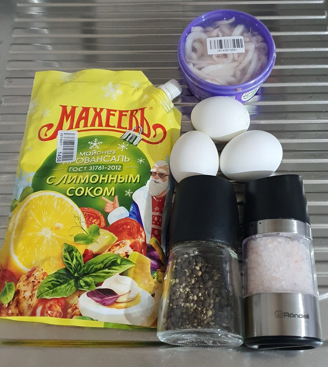 Работаете 31 декабря? Совсем нет времени на приготовление салатов? Тогда предлагаю рецепт салата из кальмаров. Это очень быстро, сытно и даже не сильно вредно. А если майонез заменить натуральным йогуртом смешанным с зернистой горчицей, то получается полезно! Ингредиенты: - кальмар в рассоле 180 грамм - яйцо куриное 3 штуки - соль, черный молотый перец и майонез по вкусу Яйца сварить до готовности и порезать мелким кубиком. Кальмары мелко нарезать. В миске соединить яйца и кальмары. Тщательно перемешать. Добавить специи и майонез. Снова тщательно перемешать.