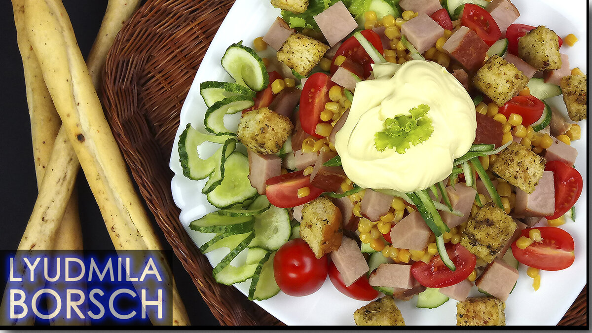 Готовы погрузиться в мир мгновенного удовольствия? Этот салат с огурцами, помидорами и мясом – идеальное решение для тех, кто ценит быстроту и вкус. За считанные минут вы создадите настоящее шедевр в кулинарии, который будет удивлять и радовать вас каждый раз. Куриное мясо крупно нарежем. Выложим на плоское блюдо. Нарежем полукольцами огурец и также выложим, сверху мяса. Ветчину нарезаем кубиками и кладем сверху. Затем помидоры. Сверху посыпаем кукурузой, еще немного ветчины и огурца. Украсим салатом, огурцом и выложим сверху майонез. А что бы было вкуснее, сверху добавим домашние сухарики Рецепт: