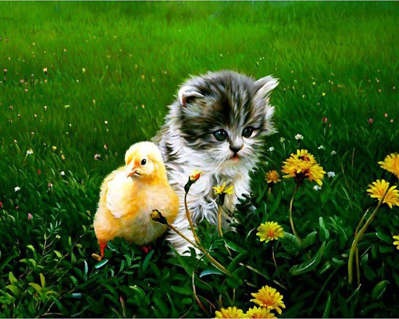 Тут шарик зашевелился и рассыпался. Перед собой они увидели желтый пушистый комочек, который слегка пошатывался на тоненьких еще неокрепших ножках. Котенок со щенком стали внимательно рассматривать его. Они хотели понять на кого он мог быть похож? Но никого похожего они раньше не видели у себя во дворе.
