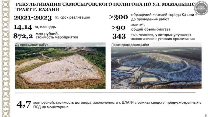 Работы по восстановлению Самосыровского полигона в Казани завершены. Министр экологии и природных ресурсов республики Александр Шадриков сообщил об этом в прямом эфире программы «Татарстан онлайн». Шадриков отметил, что благодаря федеральному проекту «Чистая страна» и нацпроекту «Экология» удалось ликвидировать этот объект негативного воздействия. Рекультивация свалки продолжалась с 2021 года с использованием системы активной дегазации. Теперь свалочный газ будет использоваться для производства электроэнергии, что улучшит условия проживания для 343 тыс. человек.