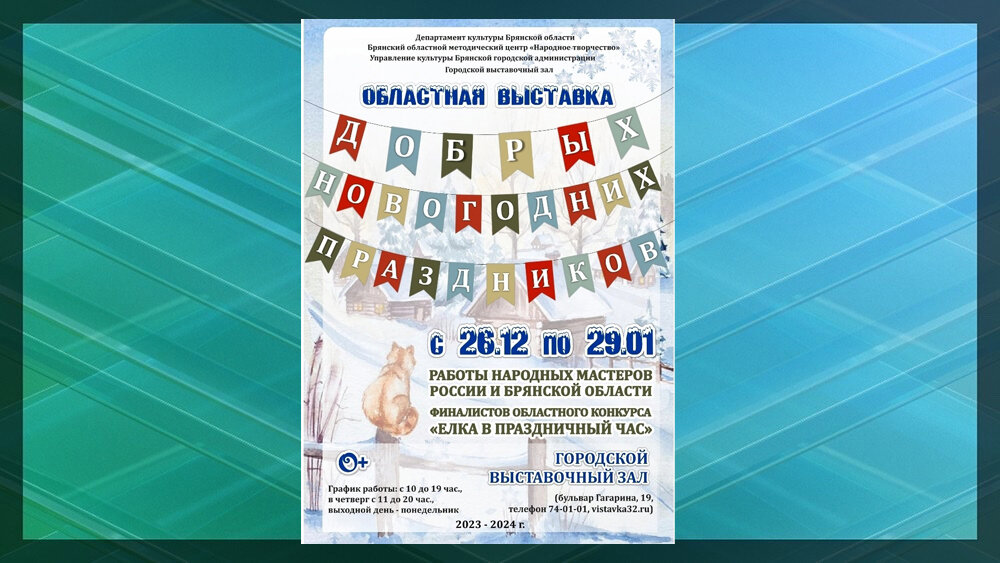В Брянске 26 декабря состоится открытие областной выставки «Добрых новогодних праздников» областного методического центра «Народное творчество». Экспозицию представят в городском выставочном зале. Свои работы представят народные мастера России и Брянской области. Зрители увидят изделия декоративно-прикладного искусства, выполненные в различных техниках: лозоплетения, художественной вышивки, резьбы и росписи по дереву, художественного валяния, лоскутного шитья, народной и авторской куклы, художественного стекла и многое другое. Экспозицию составят индивидуальные и коллективные работы народных мастеров России и Брянской области, а также финалистов областного конкурса «Елка в праздничный час». Выставка продлится до 29 января 2024 года. Возрастное ограничение: 0+ В Брянске откроется выставка декоративно-прикладного искусства «Добрых новогодних праздников»