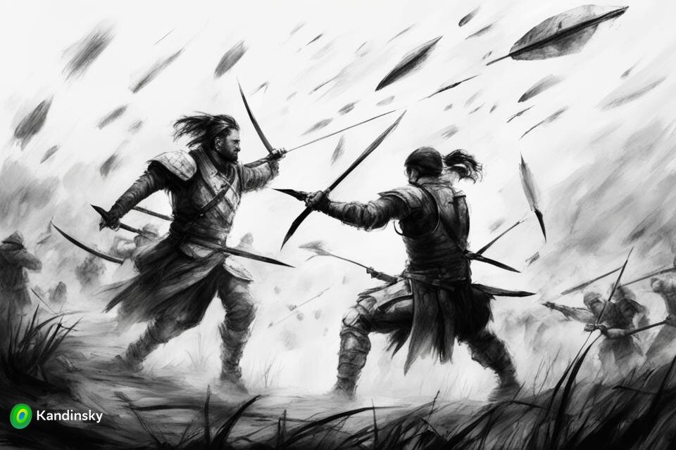 Над открывшимся перед взором ребят полем висело облако пыли, лучи солнца не проникали сквозь тучи стрел, летящих в разные стороны. Земля гудела от топота тысячи ног. Великая битва шла не на жизнь, а на смерть. Половина воинов были одеты в черные одежды, вторая половина — в коричневые. Кто с кем рубится — не понятно. Иванушка, немного придя в себя, начал уже размахивать копьём, но тут сзади наших героев схватили чьи-то мощные руки и утянули опять в лес. Там, в укрытии, ребята увидели, что они в объятиях двух русобородых великанов. Третий великан лежал на траве. Похоже он был без сознания, многочисленные раны на его теле сочились кровью. — Ага, вот и высокоточное оружие подоспело, — самый могучий из богатырей разжал пальцы Вани и вытащил из его руки копьё. — Для нас принесли? Молодцы! — Это моё копьё! — Ванюшка не собирался так просто расставаться со своей любимой игрушкой. — Кто вы такие? — Ты чего такой дерзкий, а? Ну-ка, сбавь обороты. Мы — богатыри, защищаем королевство по контракту