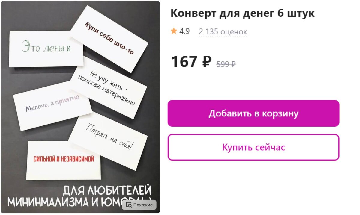 Деньги - самый популярный подарок. Но даже его можно преподнести интересно и креативно. Сегодня мы расскажем, как это сделать. 1. Конверт для любителей минимализма и юмора Набор конвертов для денег 6 штук. Молодежные конверты для денег с прикольными фразами понравятся любому парнюи или девушке. Артикул 152327340 2. Оригинальная купюрница для денег Подарить оригинально деньги можно с помощью нашей красивой деревянной шкатулки. Наш подарочный конверт с гравировкой и рисунком изготовлен из экологически чистой фанеры. Шкатулка для денег подходит для различных купюр, драгоценностей, украшений, сертификатов. Артикул 82580182 3. Конверт-открытка для денег Оригинальный бумажный конверт для денег размером 15 см х 13 см. Артикул 184657260 4. Подарочный конверт В универсальный конверт также поместятся подарочный сертификат или карточка, билеты в театр или приглашение, небольшая шоколадка, украшения или милые мелочи, мини открытка с пожеланиями Артикул 99151297 5. Коробочка для денег Деньги - это