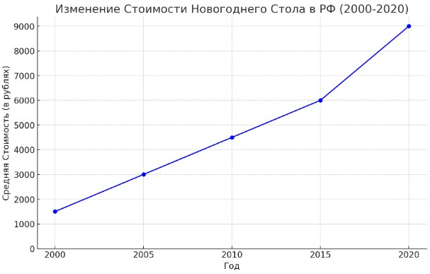 Привет! С наступлением новогодних праздников, давайте рассмотрим, как изменилась стоимость новогоднего стола в России за последние 20 лет. Это не просто цифры – они отражают влияние инфляции и различных экономических кризисов на нашу повседневную жизнь. На графике ниже представлено, как менялась средняя стоимость новогоднего стола в РФ с 2000 по 2020 год: Как видно из графика, за последние два десятилетия стоимость новогоднего стола значительно выросла. Это отражает общую тенденцию инфляции в стране, когда деньги теряют свою покупательную способность, и для покупки того же количества товаров требуется всё больше денег. Анализ периодов: Это исследование подчеркивает важность понимания инфляции и её влияния на нашу финансовую жизнь. Осознание этих факторов поможет нам лучше планировать свои расходы и разрабатывать стратегии для сохранения финансового благополучия в меняющемся экономическом ландшафте. Будьте в курсе и планируйте заранее, чтобы наслаждаться праздниками, не беспокоясь о фин