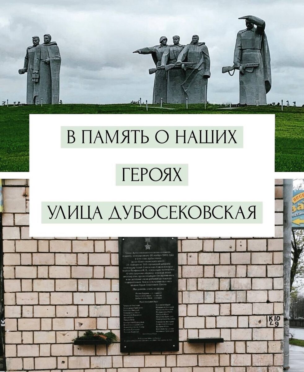 Панфиловцы Улица Дубосековская названа в память о героических событиях, связанных с боями, которые развернулись в этом районе во время Великой Отечественной войны. Здесь, у разъезда Дубосеково, под Москвой, 16 ноября 1941 года части 316-й стрелковой дивизии генерала И. В. Панфилова совершили свой бессмертный подвиг, отражая наступление немецко-фашистских захватчиков. Именно здесь 28 героев-панфиловцев проявили мужество и героизм, не пропуская врага к Москве. Этот подвиг был оценен как одно из самых ярких и важных событий в истории Великой Отечественной войны. Их доблестные поступки стали символом сопротивления и патриотизма, их имена остались в памяти многих поколений как образец преданности Родине и героизма в борьбе за свободу и независимость России. Через 25 лет после этого сражения в 1967 году в деревне Нелидово, недалеко от места боя, был открыт музей 28 Героев-панфиловцев. Помимо этого, по адресу Волоколамское шоссе 10 была установлена мемориальная доска в честь памяти наших