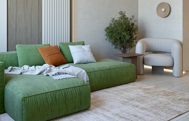 Стильные и функциональные решения для вашего дома Планировка этой трехкомнатной квартиры нестандартная, и чтобы избежать длинного коридора, гостиную расположили напротив кухни. Дизайнер Вера Шеверденок применила интересные и практичные решения, которые помогли сделать небольшую гостиную функциональной и уютной. За основу она взяла минималистичный стиль с элементами джапанди. Показываем классные идеи из проекта, которые помогут сделать интерьер главной комнаты в доме красивым, практичным и комфортным. Интерьер гостиной выполнен в стиле джапанди, поэтому в нем доминируют светлые тона с акцентными природными оттенками и деревянными текстурами. Для отделки стен использовали арт-бетон, для потолка — ГКЛ, на пол уложили инженерную доску. Холодность бетонной поверхности компенсируется обилием дерева, создавая теплую, но не вычурную атмосферу. Для отделки стен за диваном и телевизором использовали гипсовые панели, имитирующие реечную раскладку. В комбинации с деревянной поверхностью реечные па