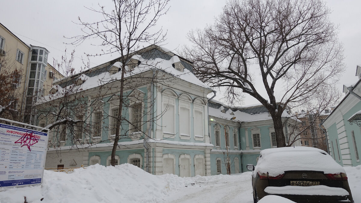Это палаты князей Долгоруковых. Считается, что этот особняк в стиле барокко построен в 1764 году. Но возводился он тогда на основе уже стоявших здесь белокаменных и кирпичных палат XVI–XVII веков. Это было учтено при реставрации, отмеченной в 1996 году, как лауреат конкурса «За лучшую реставрацию и реконструкцию в историческом центре Москвы». Если обойти здание по кругу, видны специально открытые взгляду прохожих части стен более древней кладки, «обнятые» новыми стенами в XVIII веке, отреставрированными вместе уже в наше время.