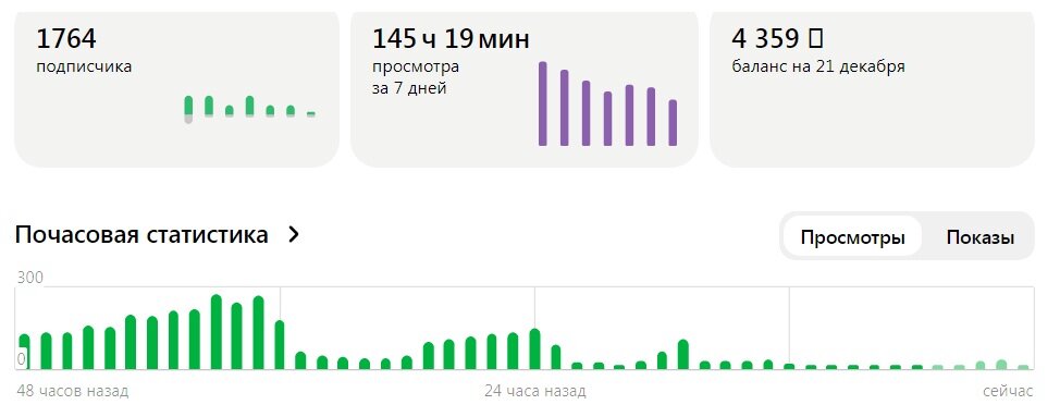 В пол показы не впервые уходят. Да и "обвал" с каких-то 300-500 часовых не то же самое что со 100 000. Если бы не принципы начисления нынешней монетизации. Всё таки платят хоть и за сильно урезаемое, но время просмотра. А без показов, нет и просмотров)) В прошлом я в такие дни бросался вытаскивать канал, для чего закидывал по 10-20 публикаций разного формата в день. Несколько дней такого постинга, каждый раз, вытаскивали канал из ямы и восстанавливали показы. Сегодня не хочу, нет настроя, нет настроения. Буду в спокойном режиме, без напряга, постить по настроению, до конца года. А там вообще посмотрим, что за ново-введения придумали нам Дзеноправители. А у вас как прошли последние изменеия в Дзен, были последствия заметные? Спасибо что дочитали до конца. Удачи!!!
