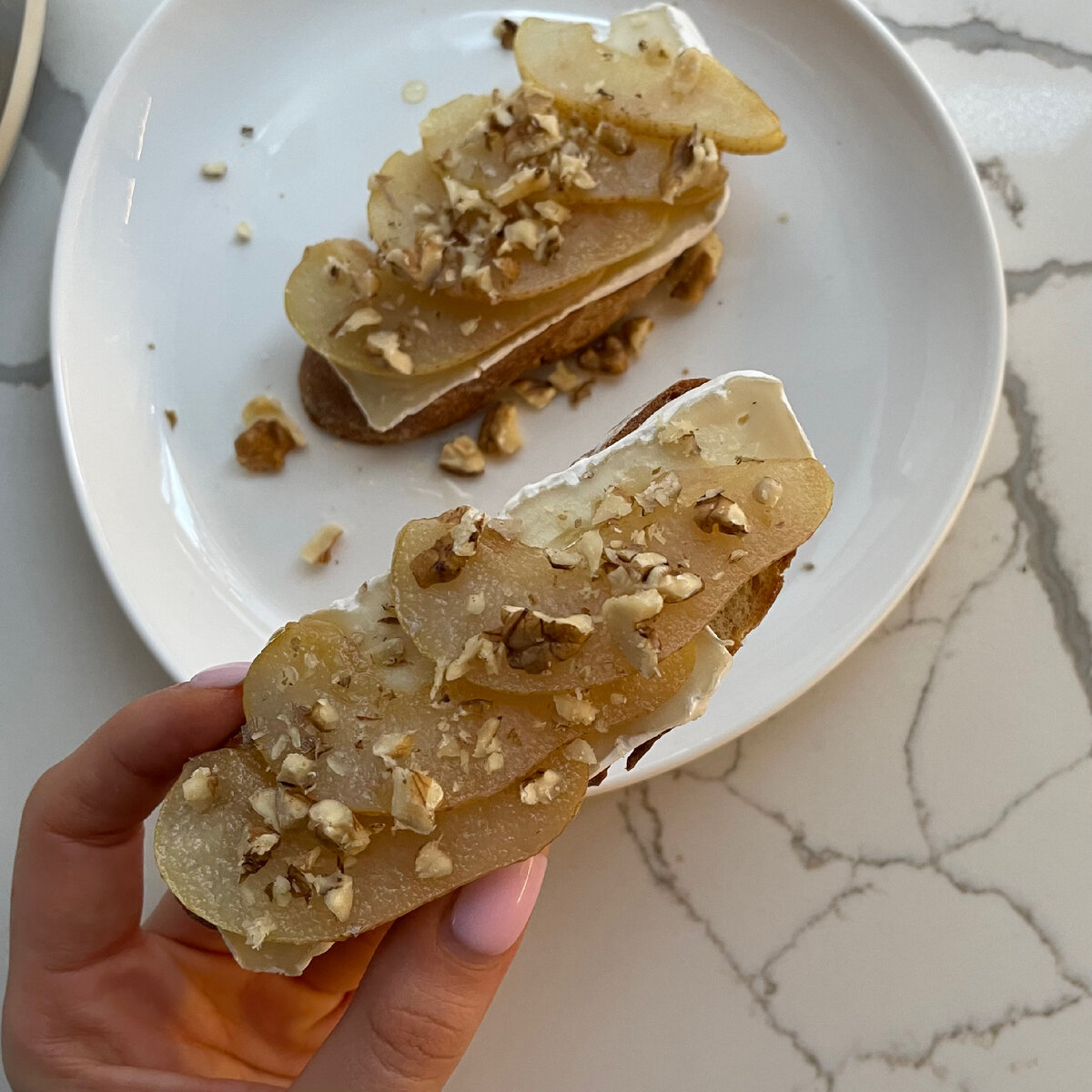 Брускетта с сыром бри, карамелизированной грушей, грецкими орехами и медом Ингредиенты: Приятного аппетита!