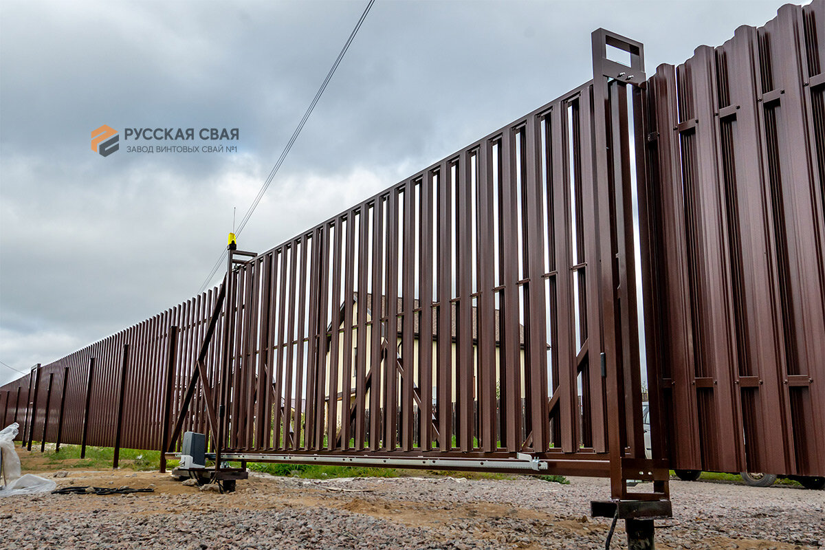 Свайно-винтовой фундамент используется для установки откатных ворот из более легких материалов, например, металлического штакетника. Это оптимальный вариант для монтажа ворот на глинистых, болотистых грунтах, а также на участках, где внутренние воды расположены близко к поверхности земли. Антикоррозийное покрытие защищает опоры от постоянного контакта с влагой, предотвращает окисление металла и надолго сохраняет внешний вид и прочность металлических свай.