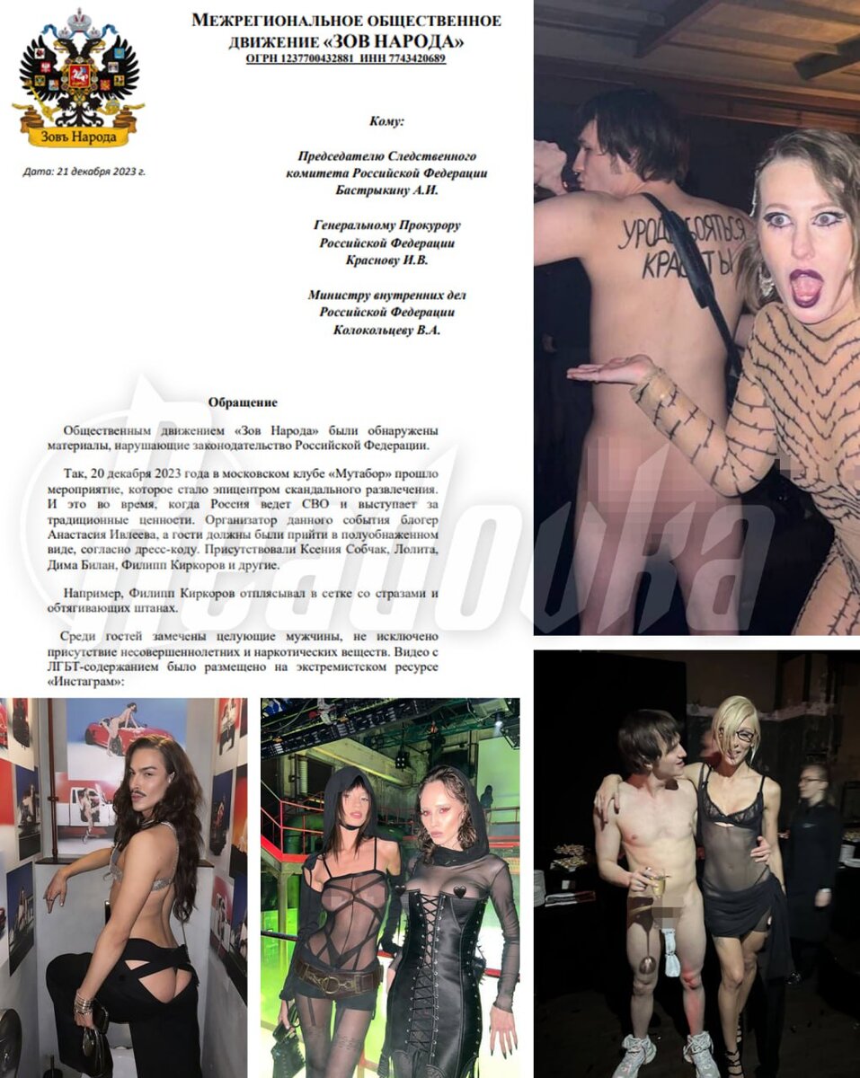 Организатор "позорной вакханалии" разгуливала по клубу в откровенном наряде с цепью-колье за 23 млн рублей. В московском клубе "Мутабор" отгремела скандальная вечеринка блогера, телеведущей и актрисы Анастасии Ивлеевой. Мероприятие посетили звёзды шоу-бизнеса: Дима Билан, Ксения Собчак, Лолита Милявская, Мария Миногарова и др. Съезд представителей богемы приковал внимание общественности и вызвал волну недовольства из-за вызывающего дресс-кода almost naked. Селебрити присутствовали на зрелище практически полностью в обнажённом виде. Один из участников оргии — рэпер VACIO — вдохновился нарядом фронтмена группы Red Hot Chili Peppers Энтони Кидиса, прийдя только в кроссовках и носке, скрывающим причинное место. Организатор "позорной вакханалии" разгуливала по клубу в просвечивающемся платье с цепью-колье за 23 млн рублей. Тошнотворные кадры облетели соцсети утром 21 декабря. Общественники призвали МВД, СК и прокуратуру проверить Ивлееву на пропаганду ЛГБТ и дать оценку "скандальному развле
