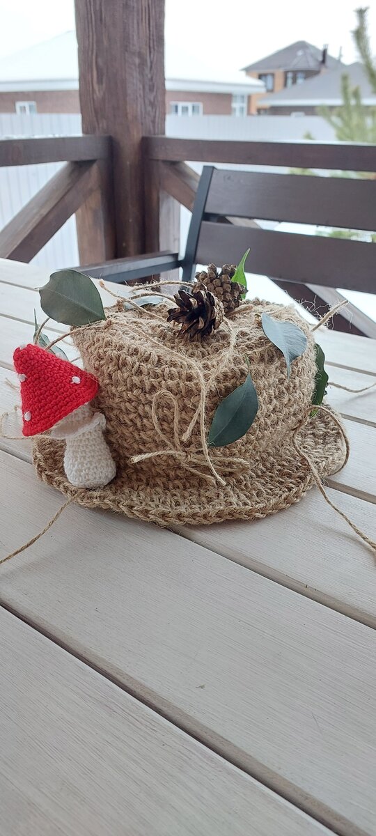 Берём джут 3 мм и крючок потолще. Шапку вяжу крючком 6 по описанию ниже. Поля делаю не широкие 2 см. Шишки из леса, листья настоящие от фикуса, но можно и из бумаги цветной вырезать дубовые например. Мухомор как связать есть информация в свободном доступе в интернете, вязала не я, дочка. Жилет Одеваем на верх папиной большой футболки. Жилет вяжу крючком 10 из джута 3 мм. Длинный прямоугольник с прорезью для головы. По бокам не сшиваю, подвязываю канатом из джута. Листья привязываю ниткой из джута. Раз, два, три и костюм готов 🙈 Спасибо за внимание 🫶