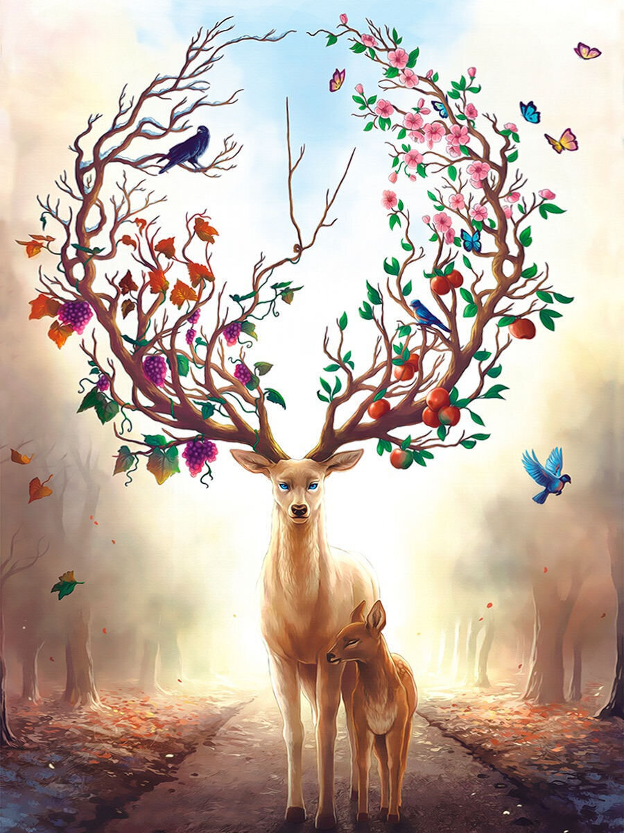 1. Невинность и чистота. Олень часто символизирует состояние невинности и чистоты из-за своей грациозной и нежной натуры. Он представляет собой дикие аспекты психики, не затронутые социальными условиями. 2. Духовное путешествие. Олень связан с духовной трансформацией и пробуждением. Его способность перемещаться по разным ландшафтам и исчезать в лесу отражает стремление человека к самопознанию и внутреннему росту.