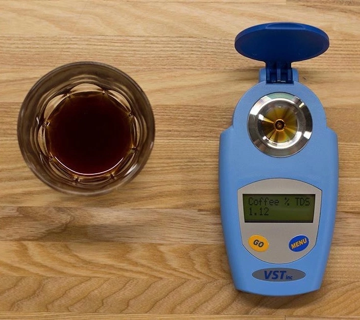 Есть два частых заблуждения о крепости кофе: Крепость — это НЕ горечь. Крепость — это НЕ содержание кофеина. Оба определения неправильные (с профессиональной точки зрения). Вкратце: Горечь — это про вкусовые ощущения Содержание кофеина — про бодрящий эффект. ? В чем же соль тогда ? О крепости кофе можно говорить только относительно напитка, а не зерен! Крепость возможно измерить в цифрах. Она определяется как TDS. TDS (Total Dissolved Solids) — общее количество растворенных частиц в жидкости (кофе в воде). Когда мы завариваем кофе, то в воде растворяются составные компоненты кофе: сахара, кислоты, кофеин, масла и ароматические соединения. Всего более 350 компонентов. Так вот, говоря о крепости, мы подразумеваем соотношение этих компонентов и воды. Specialty Coffee Association выявила, что крепость (насыщенность) готового напитка должна быть в пределах от 1,15% до 1,45% TDS. Прибор для измерения — рефрактометр. Как отрегулировать крепость кофе? Не меняйте все аспекты р