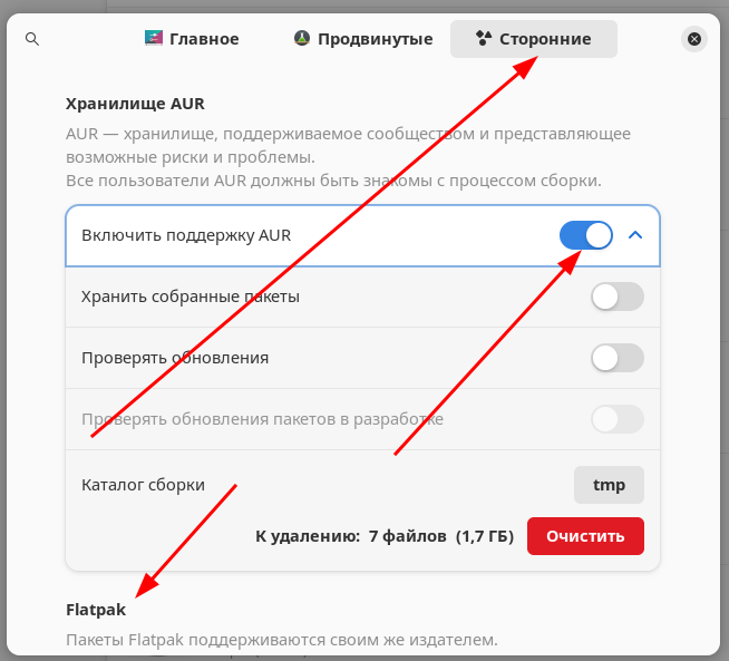 Ну, думаю - полезное приложение, надо брать! Установил на своей Manjaro через Flatpak. Если кто-то не знает AUR и Flatpak можно включить в стандартном установщике, открыв настройки: