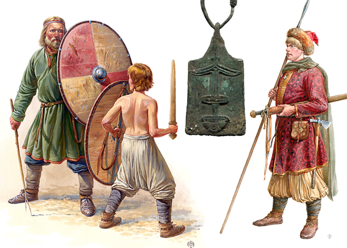 В настоящее время известна серия древнерусских подвесок , на которых княжеские двузубцы или трезубцы сопровождаются изображениями, не имеющими отношения к геральдике Рюриковичей: «стяг» (Белецкий 2004: 252, 313, 318 № 40, 53), «рог» (Белецкий 2004: 252, 253, 318, № 53), «меч-молот» (Белецкий 2004: 258, 259, 310, № 50: Белецкий, Тарлаковский 2011: 104-105). Подобные изображения встречаются, наряду с двузубцами и трезубцами Рюриковичей, среди граффити на монетах (Нахапетян, Фомин 1994: № 74а, 259а; Добровольский, Дубов, Кузьменко 1991: 27, 69, 72, 78, 79, 105, 193, 229, 242, 245, 251, 313, 327, 354, 369, 382, 412, 416, 427,)