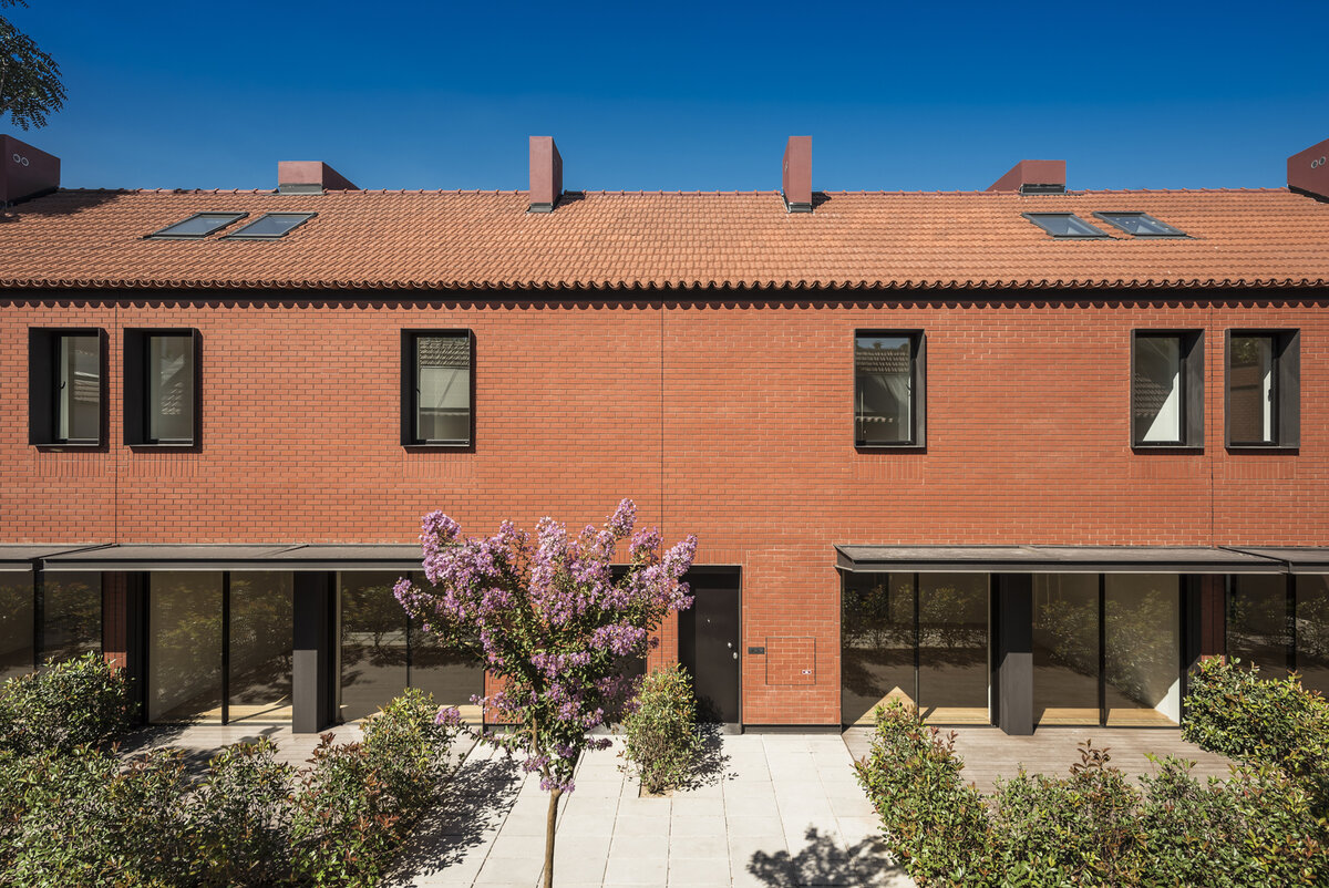 Раньше на месте этого нового дома были обычные гаражные ворота, какие можно увидеть по всему городу. За дверью проход, заканчивающийся каменной аркой, вел на участок земли с тремя заброшенными складами. Единственное сходство с нынешней реальностью — это арка, которая сохранилась. Все остальное изменилось к лучшему. Улица Руа-да-Жункейра, на которой располагается дом, находится в непосредственной близости от фонтана Жункейра — еще один хорошо охраняемый объект в Лиссабоне. На участке нового проекта старые склады уступили место современному кондоминиуму из двух рядов домов, разделенных общим садом. Дома перекликаются со старыми складами благодаря использованию красного кирпича, которым облицованы фасады, и железа, видимого в некоторых архитектурных элементах. Хотя это закрытый кондоминиум, ощущение замкнутости не присутствует. Здания открыты солнечному свету, а окружающие деревья создают чувство свободы и единения с природой. Главное достоинство проекта — это то, как он соединяет интерье