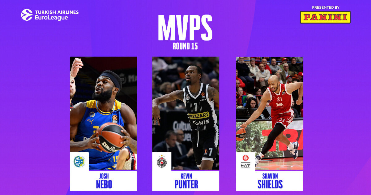 Сразу три игрока получили звание MVP 15-го тура сезона Евролиги-2023/24 – Джош Нибо («Маккаби Тель-Авив»), Кевин Пантер («Партизан») и Шейвон Шилдс («Милан»). Шилдс, Нибо и Пантер получили по 25 баллов за эффективность и помогли своим командам победить в прошедшем туре регулярного чемпионата. Шилдс привел «Милан» к домашней победе над «Виллербаном», набрав 13 очков, 5 подборов, 6 передач и 3 перехвата. Нибо отметился 17 очками и 11 подборами в победном матче против «Басконии». Пантер помог «Партизану» одержать выездную победу над «Валенсией», набрав 13 очков, 9 подборов, 3 передачи, 2 перехвата и 1 блок-шот.
