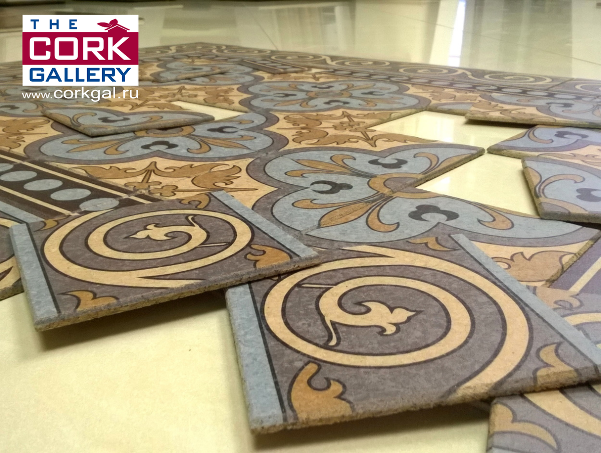 Вначале из напольной пробки нарезали квадраты размером 150х150мм для имитации плитки, а также внутренний бордюр. На всех элементах сняли фаску. На каждом квадрате напечатали соответствующий узор.