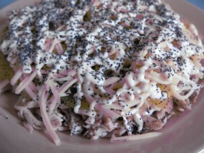 На плоское блюдо выкладываем слоями как указано выше, в майонез добавить мак (или можно посыпать сверху майонеза - я так и делала) и смазывать слои. Важно выкладывать все на блюдо как бы легонько (как это делают в ресторане), не прижимая слои, не злоупотребляя майонезом. Куриное мясо лучше запечь, а если отваривать - то со специями.