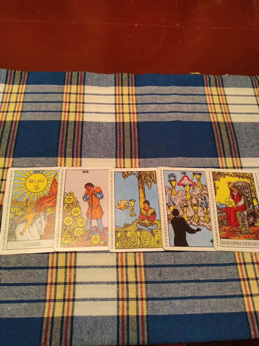 Пришлось брать дополнительные карты для уточнения, поэтому показываю расклад полностью, чтобы было понятнее, что и зачем.
