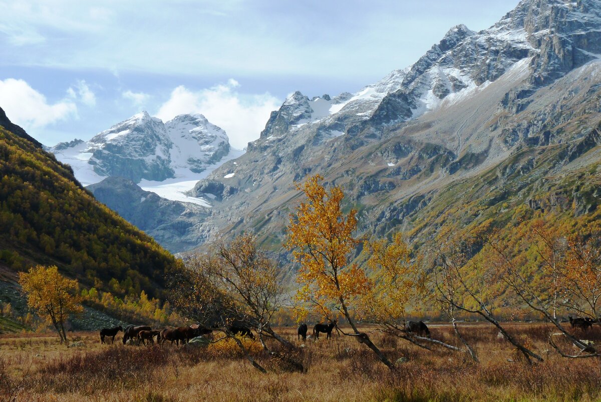 Плоское дно бывшего озера скоро сменилось скоплениями больших и маленьких камней, и целых глыб, размером с дом, скатившихся с горных утесов. Одна из них напоминала голову барана. В долине появились многочисленные березки. Только стояли они здесь не стройными красавицами, а по большей части полулежали на земле. Такой их вид свидетельствовал о суровых условиях горной зимы, когда снежные лавины скатывались с вершин и надолго накрывали своим прессом хрупкие деревца. Среди березок на вольных лугах паслись лошади и коровы. Животным было здесь раздольно – травы и воды предостаточно.