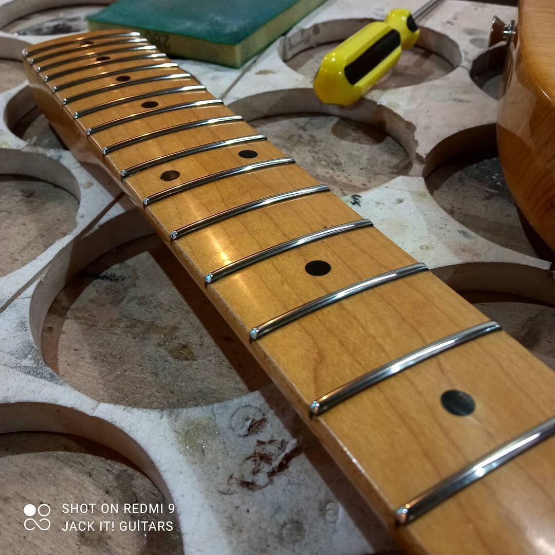 Для сохранности правильной дугообразной формы ладов, заданной радиусом накладки, при обработке проверяем ее соответствующим шаблоном, как на фото в галерее ниже. Достаточно контроля первого и последнего ладов. Форма остальных будет обеспечена обработкой. Особенно этот метод контроля важен для высоких и широких ладов.