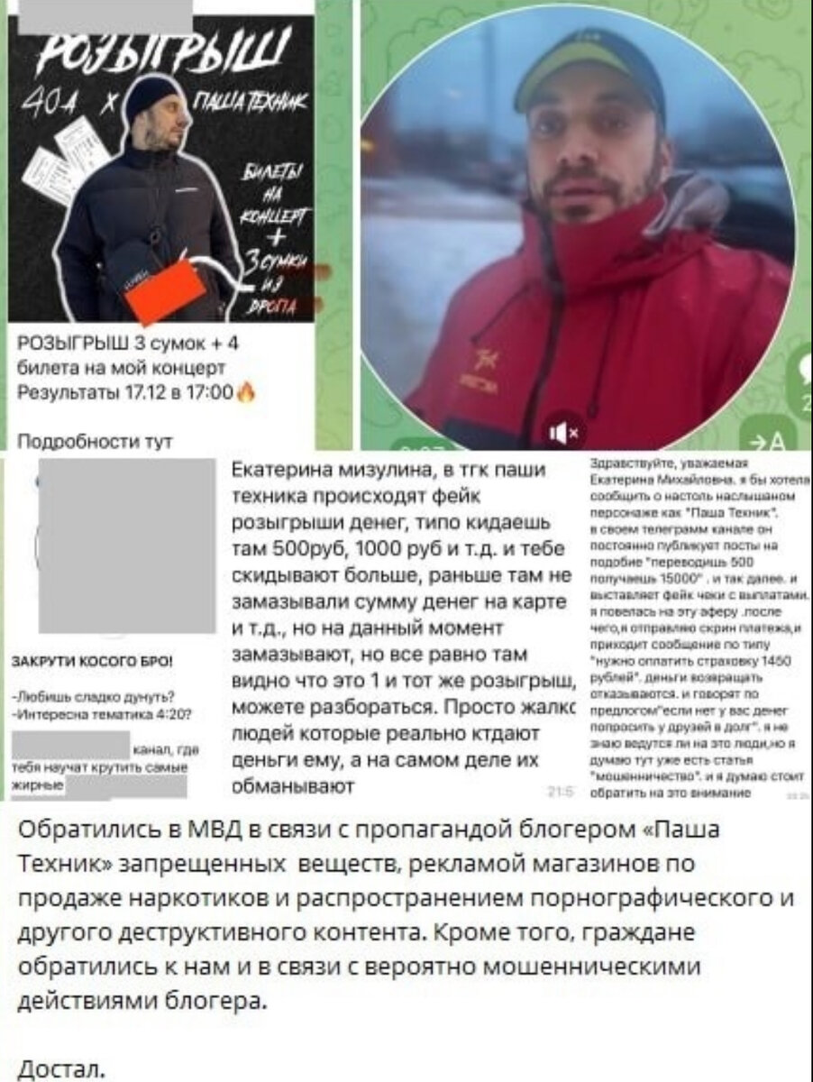 Руководитель организации "Лига безопасного интернета" уверена, что Паша Техник распространяет запрещенные препараты и вещества. В телеграм-канале Техника, Мизулина обнаружила рекламу магазинов, которые продают запрещенные вещества, а также распространение "порнографического и другого деструктивного контента".Она уверена что прикроет его канал.