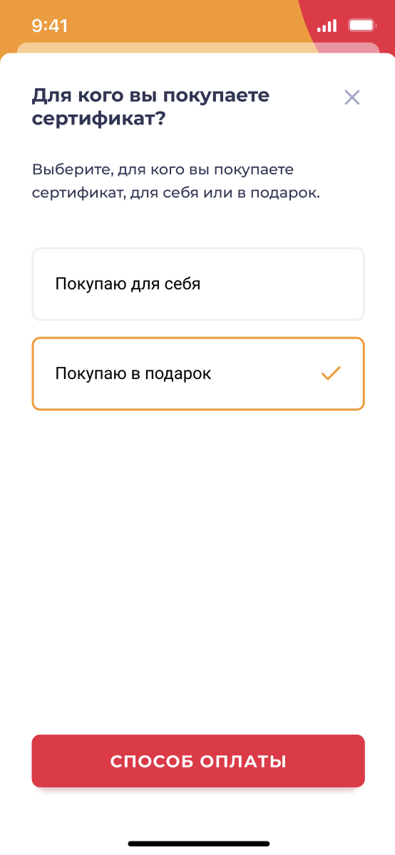 1. Вы можете купить сертификат в подарок либо подарить уже купленный ранее сертификат. При покупке сертификата, выберите "Покупаю в подарок". Дальше укажите номер телефона получателя. Также при желании вы можете указать поздравительное сообщение: