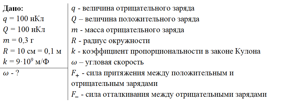 Полное условие задачи: Два одинаковых отрицательных точечных заряда по 100 нКл массой 0,3 г каждый движутся по окружности радиусом 10 см вокруг положительного заряда 100 нКл. При этом отрицательные заряды находятся на концах одного диаметра. Найдите угловую скорость вращения зарядов. Краткое условие задачи: Решение задачи: На любой из движущихся зарядов действует сила притяжения к положительному заряду где q – модуль заряда шарика, так и сила отталкивания от другого отрицательного заряда Второй закон Ньютона для движущегося по окружности шарика имеет вид или, учитывая что получим Отсюда Ответ: 15 рад/с.