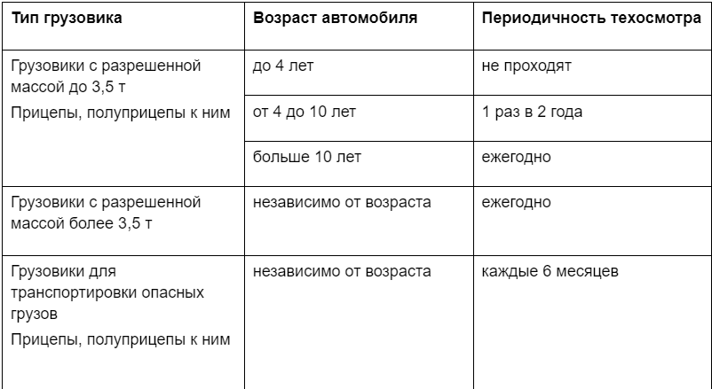 Технический осмотр грузовых автомобилей, как и наличие страховки у водителя, обязателен. Без технологической диагностической карты грузовика нельзя получить ОСАГО, а без него нельзя выезжать в рейс — за это положен штраф. В этой статье расскажем об особенностях прохождения техосмотра грузовиками, которые транспортируют грузы как внутри страны, так и за ее пределы. Какие новшества в техосмотре грузовиков появились в 2023 году? На территории России технический осмотр грузового транспорта регламентируется двумя документами: В 2023 году в правилах прохождения техосмотра появилось несколько нововведений. Среди ключевых нужно выделить следующие: Эти требования направлены на то, чтобы исключить вероятность фальсификаций в результатах техобслуживания грузовиков. Каким грузовикам и как часто нужно проходить техосмотр? Согласно статье 15 ФЗ-170 от 01.07.2011 г., технический осмотр является добровольным только для легковых автомобилей и мотоциклов. Владельцы грузовиков обязаны его проходить согл