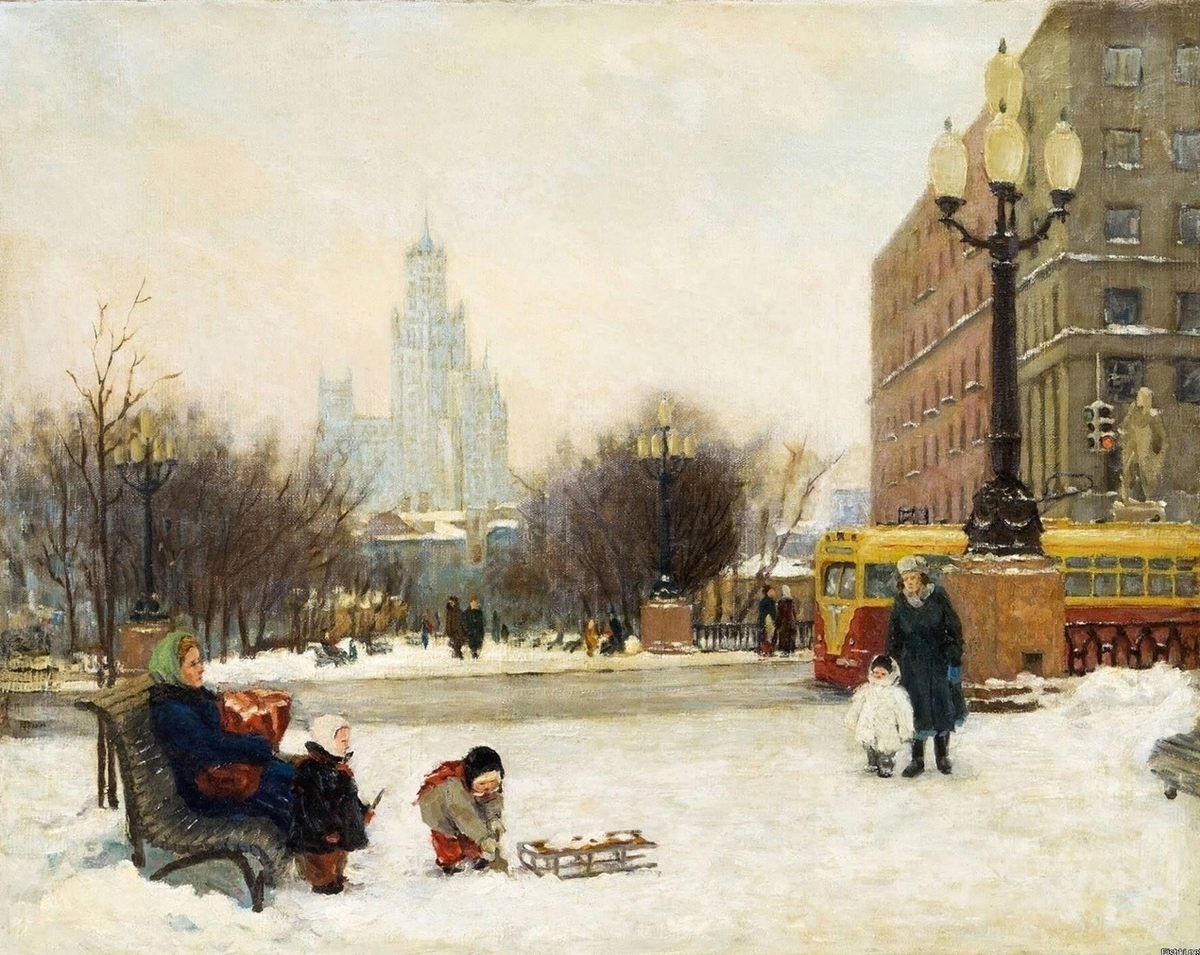 "Воронцово поле", 1950 г. Сталинская Москва на картине художника - и в ней прелестно всё! Трамвай! Малыш в шубе. Бабушка с внуками! Высотка и фонари! И стоит эта прелестная картина всего 350 000 рублей. Смотрю на эту картину - и хочется мне пересмотреть фильмы того времени. А вам что хочется?