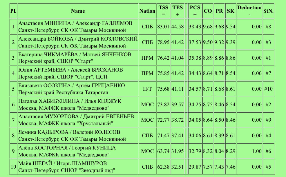 Интересный факт. Алёна Косторная принимает участие в чемпионате страны спустя четыре года. И в новой для себя дисциплине. Приятно видеть Аленку на соревнованиях. За пару дней до старта девушка заинтриговала болельщиков, показав в соц сети фрагмент из старой программы сезонов 2018-2020. Ангел — одна из лучших программ в истории одиночного фигурного катания. Алёна там была великолепна, хоть она и говорила, что это не ее образ. Программа была очень выигрышной и Алёна добилась с ней своих лучших результатов и, вероятно, спортсмены надеялись с ней улучшить свои результаты. Пока не удалось. Из грубых ошибок падение с выброса тройной риттбергер. Выбросы пока Алене с Гошей даются непросто. Но все нарабатывается, сил, терпения и много работы… Спортсмены занимают промежуточное 9 место, получив за прокат 63.74. Алена уж очень расстроилась, по моему даже немного злилась на Гошу. А у молодого человека от напряжения пошла кровь из носа…. Тяжело… Правильно Татьяна Тарасова посоветовала Алене не расс