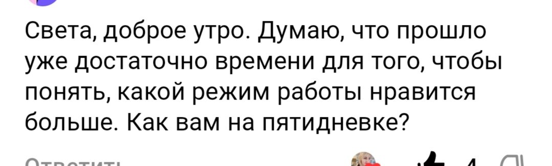 Для тех, кто подписан относительно недавно, хочу пояснить. Я пять с половиной лет работала по графику 2/2 с 8 до 20. Конечно же очень привыкла. А с июля этого года меня перевели на 5/2 с 8 до 17.