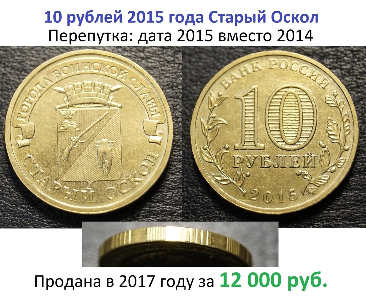 10 рублей серии "города воинской славы" - Старый Оскол за 12 000 руб. Невнимательный читатель скажет - "у меня таких много, я богат!", но как только он захочет продать такую монетку выяснится, что подобные монеты массово выпускались с датой 2014 года (тираж 10 млн. экз.) и имеют стоимость около 20 рублей. Монета же с другой датой (2015) ценятся существенно выше.