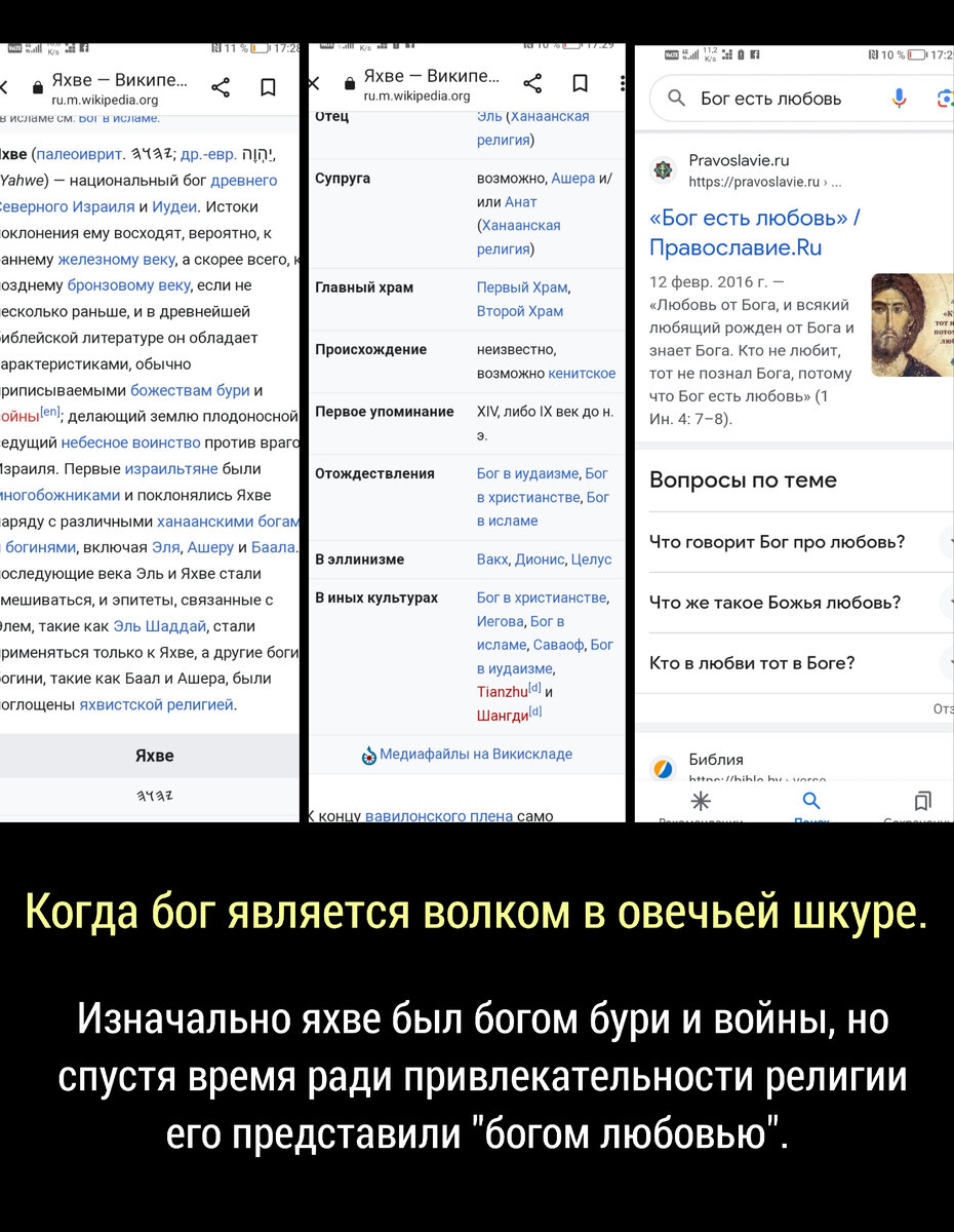 Люди до сих пор плохо знают библию, живут как зомби, установками церкви, догмами. Посмотрим, кто такой бог? ЯХВЕ. Кто такой яхве? Божок евреев. По характеристикам, соответствует богу бури и войны. Это написано исследователями религии в Википедии. Каков бог ветхого завета? Он жесток, кровожаден, деспотичен, мстителен. Когда был сьеден плод с дерева познания добра и зла, яхве выгоняет людей из рая, навлекает на них страдания, и ПРОКЛИНАЕТ ЗЕМЛЮ. То есть, земля испорчена, и вся наша жизнь, проклятием бога. Прекрасный бог? Нет. Он чудовище. И люди, не поняв этого, молятся и поклоняются ему. Что любит бог евреев? Он любит смерти, войны, разрушения, жертвоприношения. Как типичный демон. Не будем рассматривать жертвы человеческие, просто взглянем на следующее: "И вышел Ной и сыновья его, и жена его, и жены сынов его с ним; все звери, и все гады, и все птицы, все движущееся по земле, по родам своим, вышли из ковчега. И устроил Ной жертвенник Господу; и взял из всякого скота чистого и и
