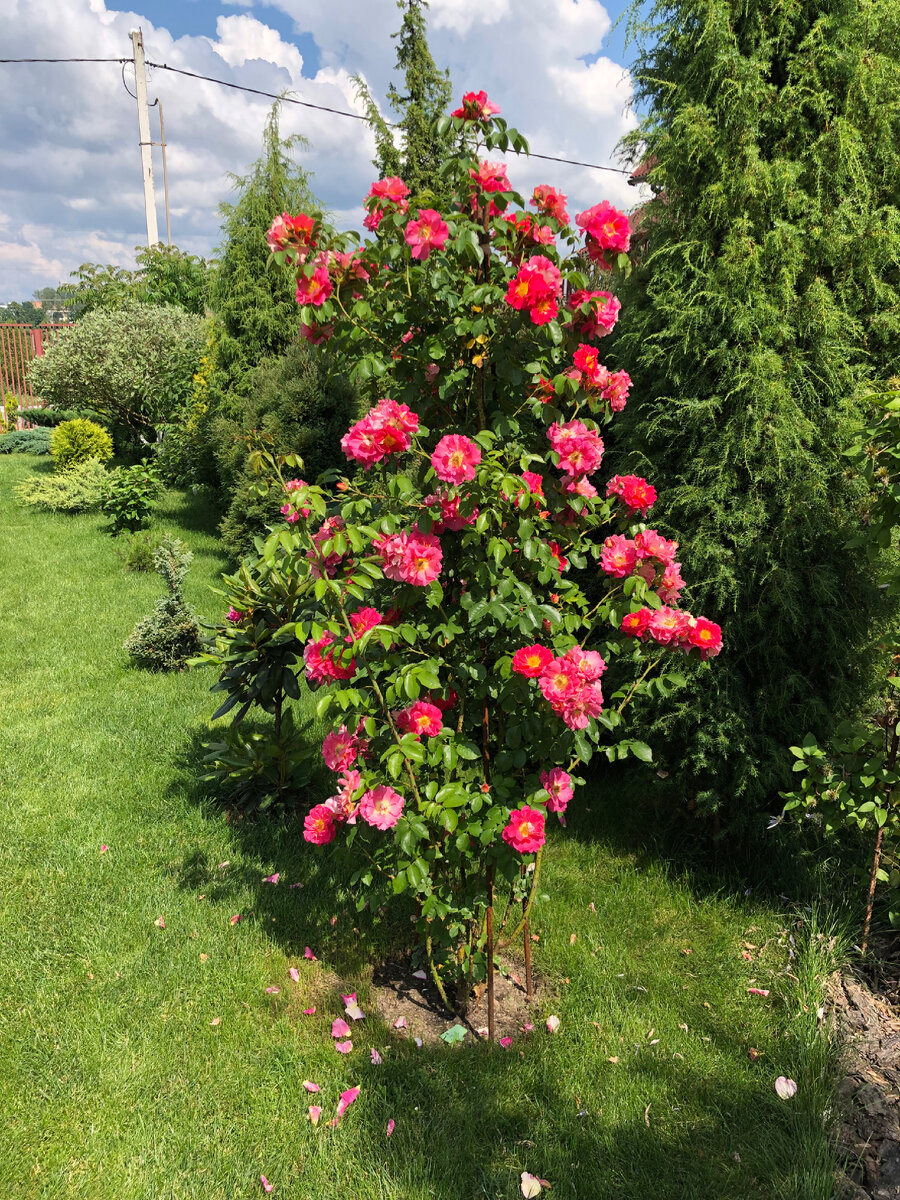 Роза Розариум Ютерсен с огромным цветком и очень пышным цветением. Я её обожаю именно за её очень обильное и очень длительное цветение, в том числе одного цветка, хорошую устойчивость к заболеваниям. Но к сожалению в моей пятой климатической зоне зимует она очень слабо, требует обязательного укрытия. Шипов у неё очень много, но я ей их прощаю, когда она зацветает снова и снова. Это роза относится к группе клаймбер, в высоту должна достигать по характеристикам 2 и более метров. В моем саду и климате, более чем 1,4 метра и не поднималась. Всё больше хочет быть каким-то кустиком и дает сильная побеги, невысокие, в общем набираем ширину.