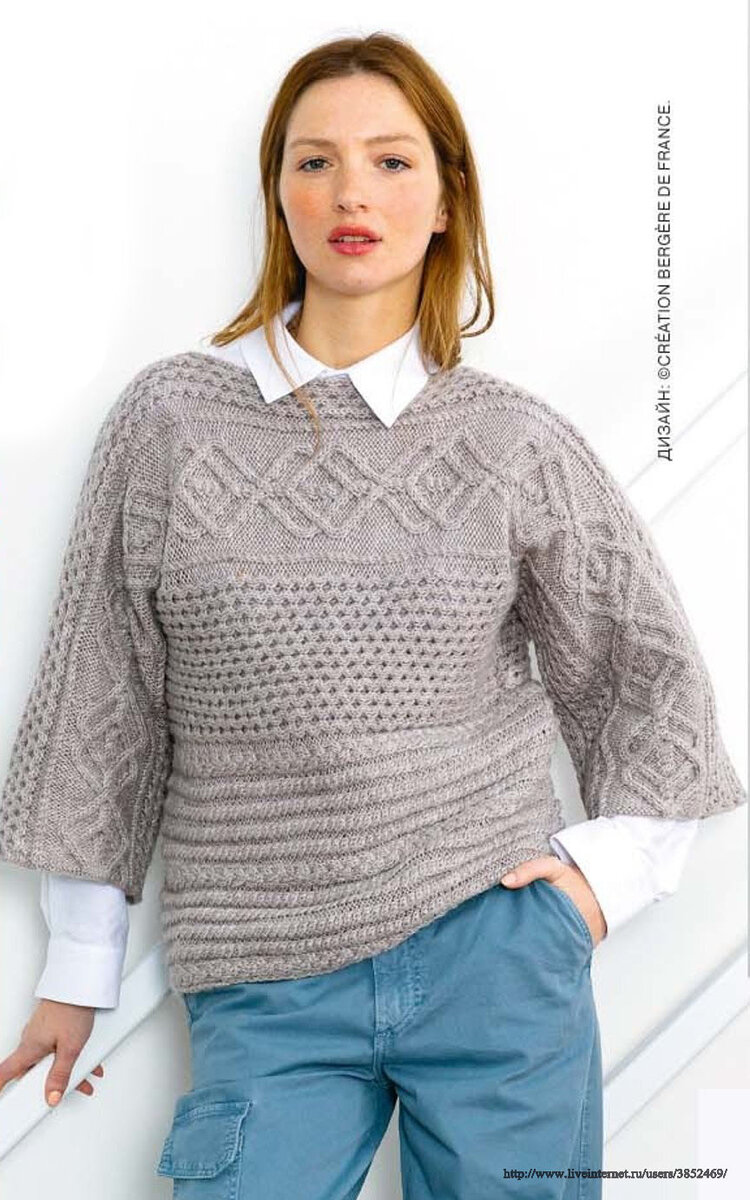 Пряжа: Bergere de France Эта модель свободного силуэта с удлиненной линией плеч виртуозно соединяет вязание лицевой гладью в технике жаккарда и вышивку по трикотажному полотну - поверх структурного узора. Работа потребует внимания и опыта, но результат того стоит! Даже отделка планок таит сюрприз: эластичная резинка разделена в середине полосой платочной вязки. Такая модель несмотря на свою рустикальность отлично впишется в разные ансамбли.