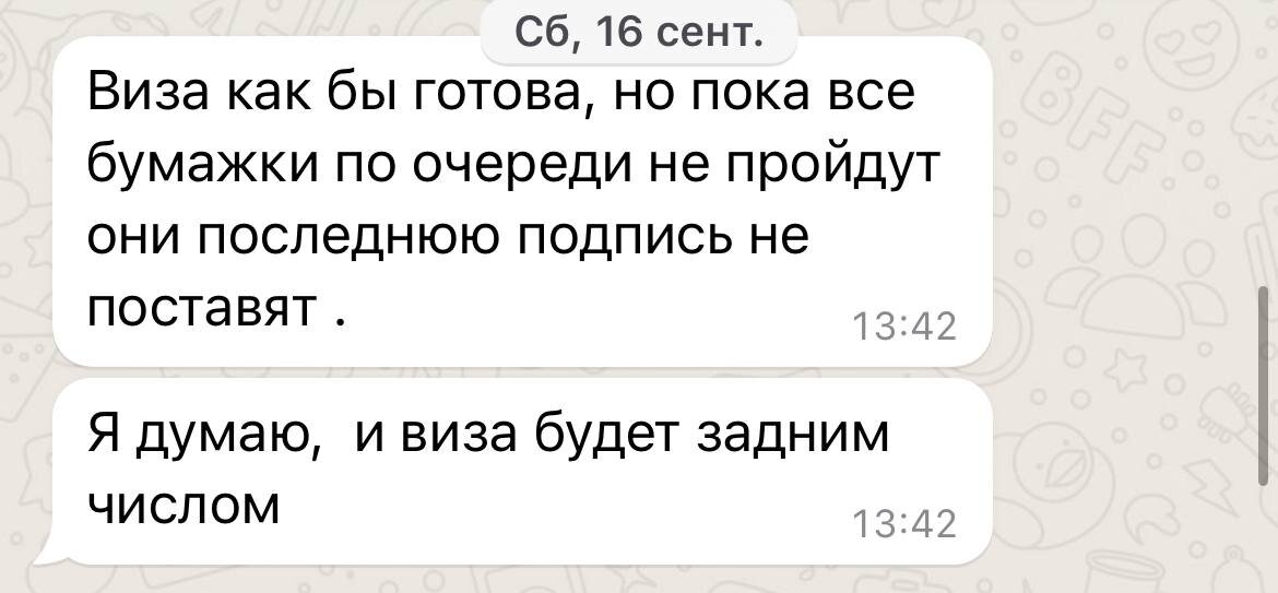 Заезжают они за мной в среду 20 сентября (внимание: до конца ВНЖ остается 4!!! дня).