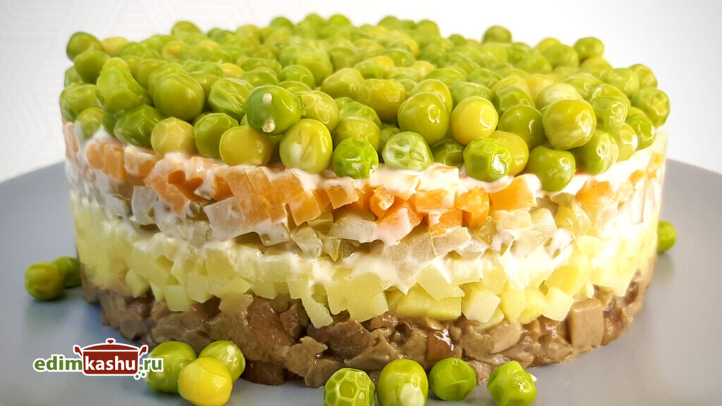 - При традиционной подаче все продукты соединить в салатнике, заправить обычным или постным майонезом и подать к столу. Также этот салат можно приготовить в кольце слоями. Для этого сначала выкладывается слой грибов. Каждый слой необходимо хорошо уплотнять. Затем слои картофеля, огурцов, моркови и зеленого горошка. По желанию и по вкусу каждый слой можно промазывать домашним майонезом. Либо только картофельный и морковный слой. Слой горошка смазывать не нужно он служит украшением верха салата. Осторожно снять кольцо и подать салат к столу.