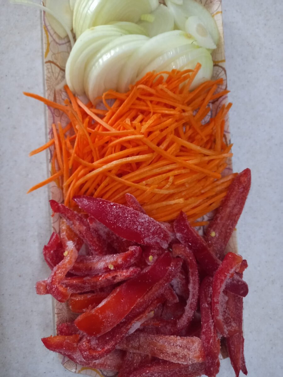 Всем привет! С вами Алена. Как вы поняли, в нашей семье все любят покушать J. Иногда это что-то серьезное, а иногда и полегче. Так, одним из самых любимых легких блюд является теплый салат. Он настолько вкусный, что, уплетая его, невозможно остановиться. Для приготовления нам понадобятся: Сразу подготавливаем все овощи: промываем их, просушиваем бумажным полотенцем и нарезаем. Баклажаны я использую сушеные, предварительно замочив их в горячей соленой воде. Помидоры и болгарский перец у меня замороженные с лета. Лук и морковь нарезаю соломкой. Баклажаны отжимаем от лишней влаги и обваливаем в крахмале. Начинаем обжаривать в растительном масле 1,5 минуты. Проделываем это с другими овощами поочередно. Для соуса смешиваем мед, уксус, соевый соус, перец молотый, измельченный чеснок, кориандр, соль и сахар. В сухой казан выливаем соус и выкладываем к нему помидоры. Обжариваем минуту и добавляем остальные овощи. Прогреваем 3 минуты. Готовый салат выкладываем на тарелку и посыпаем кунжутом. Пр