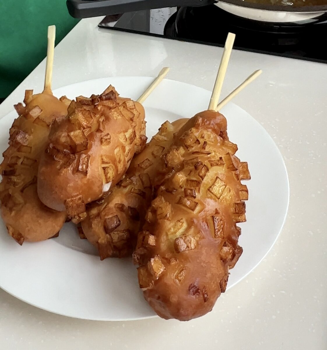 Ингредиенты😋: Способ приготовления: •Разогреть масло в глубокой сковороде •Смешать все сухие ингредиенты •Слегка взбить яйца с молоком и влить в сухую смесь •Картофель промыть, обсушить, порезать кубиками 🥔 •На шпажку насадить половину сосиски и брусок сыра моцарелла •Обмакнуть в тесто и обвалять в картофельных кубиках •Обжарить в масле до золотистой корочки🤤 Ingredients😋: 1. 3 cups flour 2. 3/4 cup corn flour 3. 2/3 cup sugar 4. 3 teaspoons salt 🥄 5. 2-3 teaspoons of baking powder 6. 3 eggs 7. ~250 ml milk 8. 3-4 potatoes 9. Sausages 10. Mozzarella for pizza 11. Vegetable oil Cooking method: •Heat oil in a deep frying pan •Mix all dry ingredients • Lightly beat eggs with milk and pour into dry mixture •Wash the potatoes, dry them, cut them into cubes 🥔 •Place half a sausage and a block of mozzarella cheese on a skewer •Dip in dough and roll in potato cubes •Fry in oil until golden brown🤤 #корндог #рецепты #еда #byfestival
