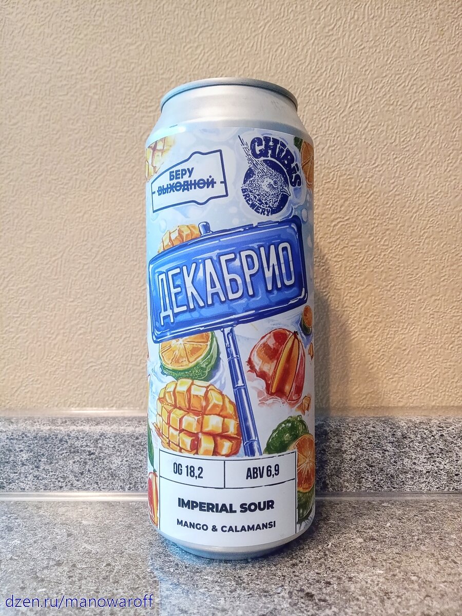 Сегодня у нас, как можно легко догадаться, очередное совместное творчество сети пивных магазинов "Беру выходной" и какой-то крафтовой пивоварни, в роли которой на сей раз снова выступила Chibis Brewery. Ну а продукт сотрудничества называется "Декабрио". Как видите, это имперский кисляк с манго и каламанси. И если первый фрукт уже порядком поднадоел, поскольку его использует каждая первая пивоварня, то сорта пива с каламанси, которые мне удалось попробовать, можно пересчитать по пальцам руки оператора циркулярной пилы со стажем. Дебют данного пива состоялся 11 декабря нынешнего года. На момент дегустации моей банке пива было 11 дней. Свежак. Срок годности составляет 365 дней при хранении в холодильнике. Почитаем, что там пивовары пишут о своем пиве: Imperial Sour, в котором каламанси придаёт достаточно новогодних цитрусов во вкус, а добавление манго делает его более тельным и округлым. Коллаборация с нашими друзьями - Сетью магазинов пивной культуры "Беру Выходной". В составе, как не с