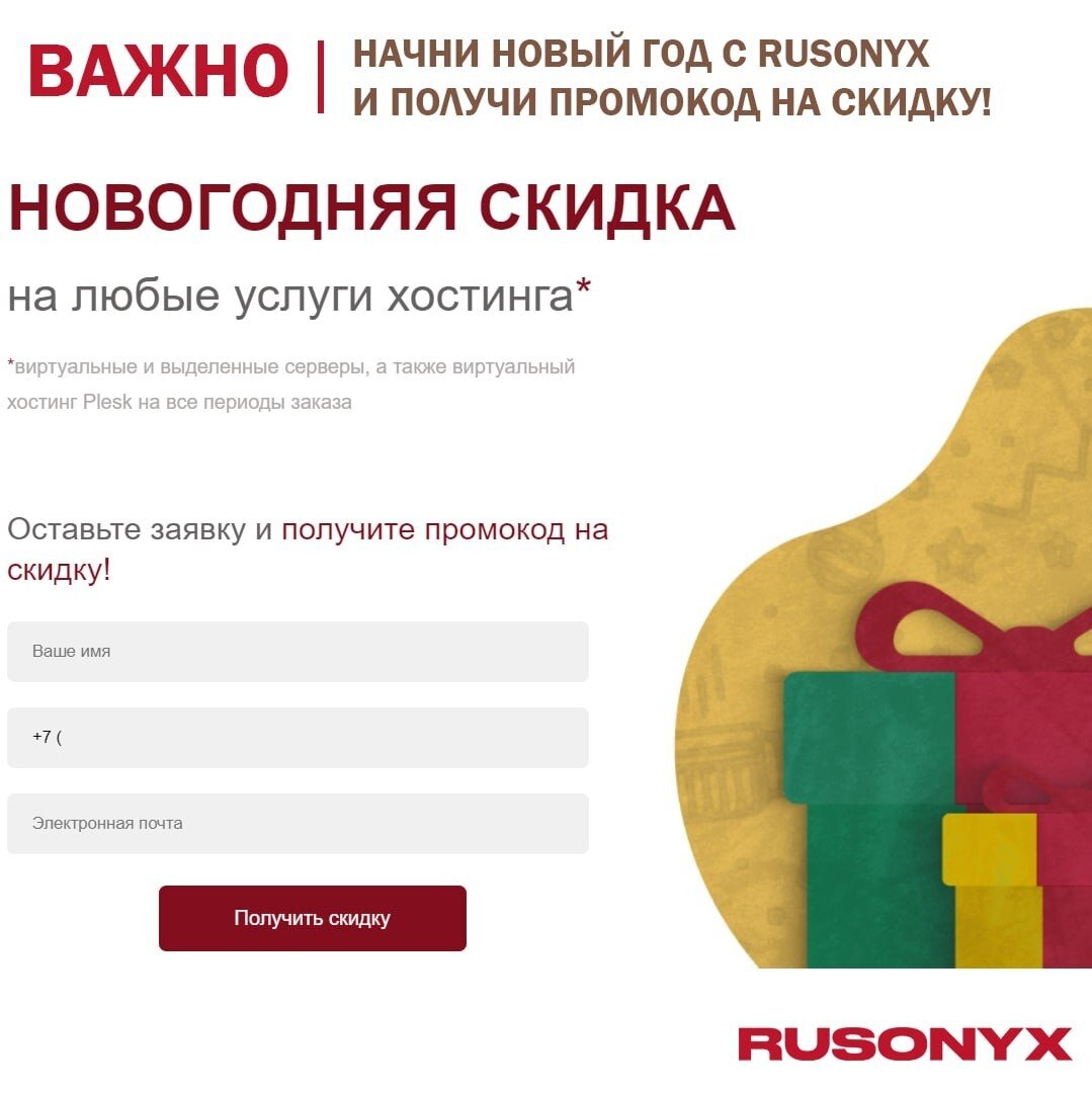 Мы приветствуем всех наших новых клиентов и в канун наступающего 2024 года дарим вам промокод на скидку при заказе виртуальных и выделенных серверов, а также виртуального хостинга Plesk. Получить ваш новогодний подарок от Rusonyx очень просто: оставьте свои контактные данные в форме в разделе "Акции" на нашем сайте и ожидайте, наши менеджеры оперативно свяжутся с вами, чтобы передать промокод.
