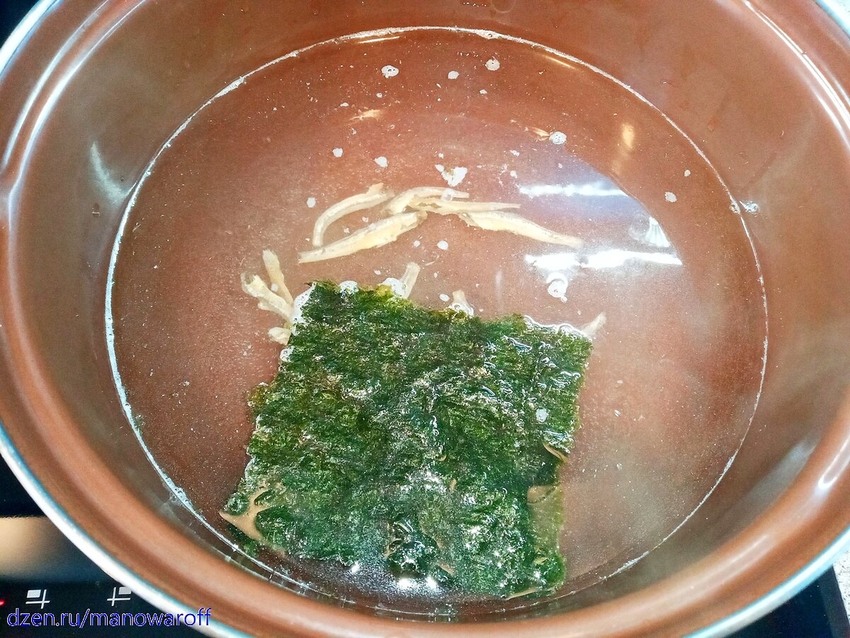 Сегодня будем готовить корейский супчик с таким вот, практически ругательным, названием. Суп простой, готовится быстро, экзотических ингредиентов практически не использует. Ингредиенты: Ингредиенты для бульона: *Сушеные анчоусы, которые продают как закуску к пиву, отлично подойдут для этой цели. **Я использовал сушеную морскую капусту для суши. Тофу режем на небольшие кубики, на один укус. Дайкон чистим, разрезаем вдоль на четыре части, которые затем нарезаем ломтиками по 0.5 см толщиной. Репчатый лук режем тонкими перьями. Зеленый лук нарезаем отрезками по сантиметру длиной. Острый перец режем произвольно (можно колечками). В кастрюлю наливаем воду, ставим на плиту на максимальный огонь и кладем анчоусы с морской капустой. Доводим до кипения, уменьшаем огонь и готовим в течение 10 минут. Шумовкой вылавливаем анчоусов с морской капустой и выкидываем. Кладем в кастрюлю дайкон с репчатым луком, ждем пока закипит и засекаем пять минут. По прошествии указанного времени давим в кастрюлю чес